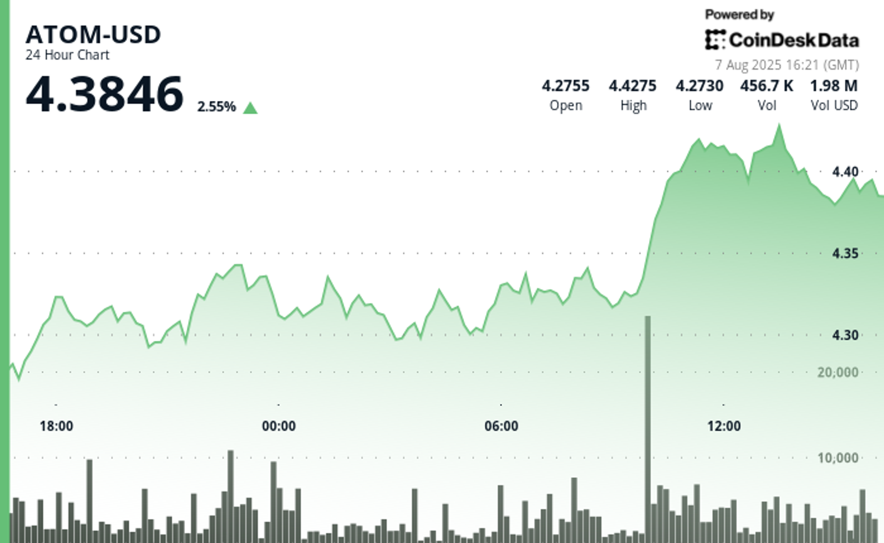 - ATOM delivers strong bullish momentum over 23 hours from August 6 15:00 to August 7 14:00. Price surges from $4.26 to $4.41, posting 3.40% gain with $0.18 range.